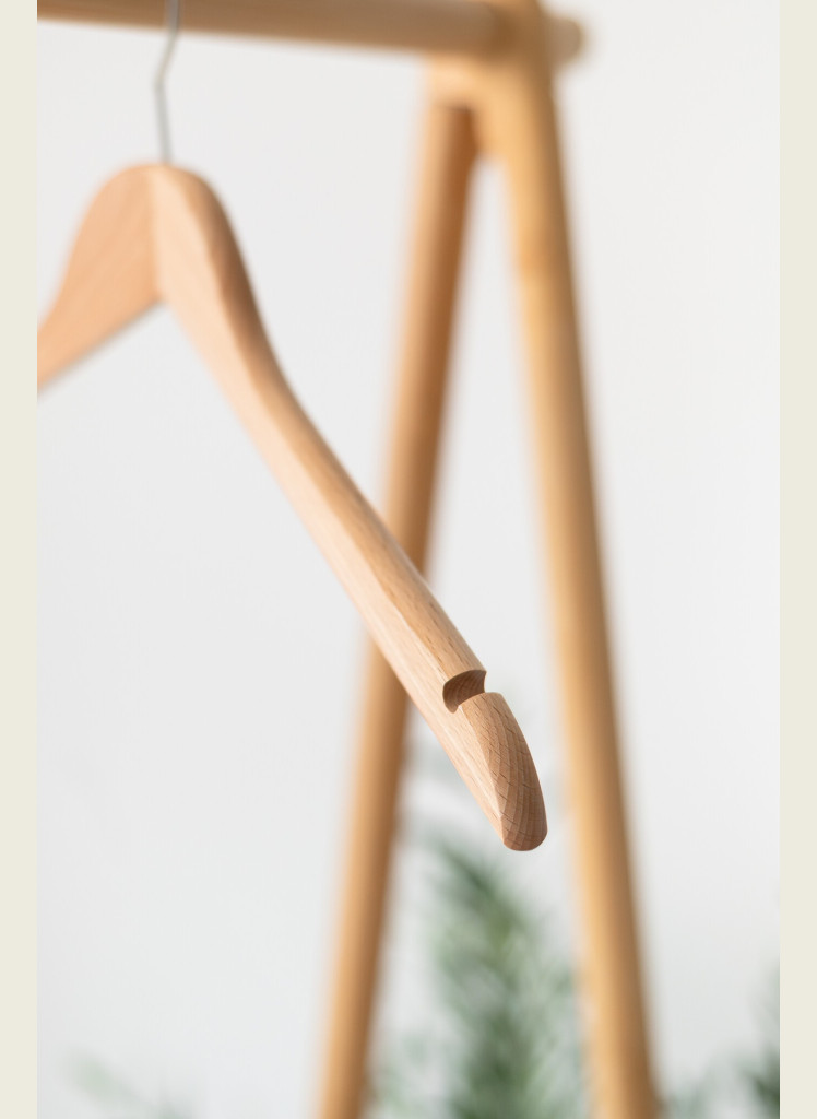 Bukové dřevo Tvarovaná ramena Boční zářezy Zakulacená horní část Tvar + stabilita na ramínkách Lakovaný povrch Otočný háček Vyrobeno v ČR