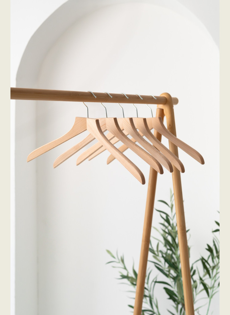 Kvalitní bukové ramínko s tvarovanými rameny a kalhotovou tyčí, které poskytuje dobrou oporu pro sak..