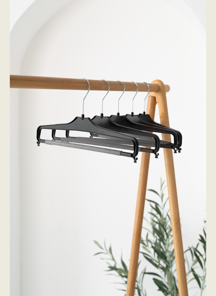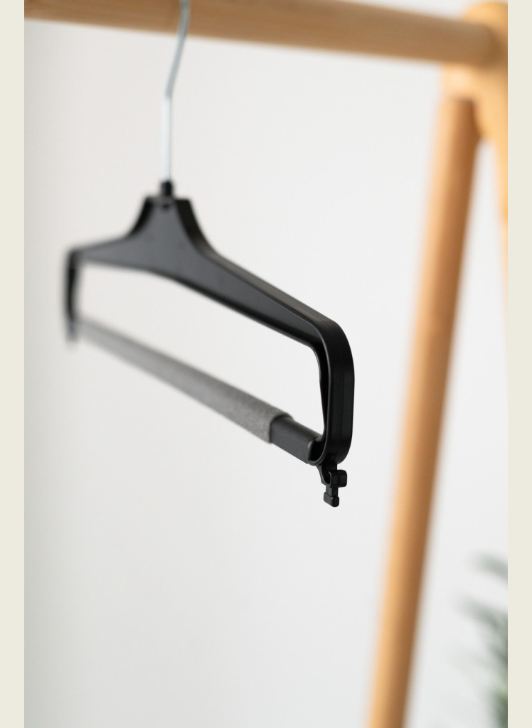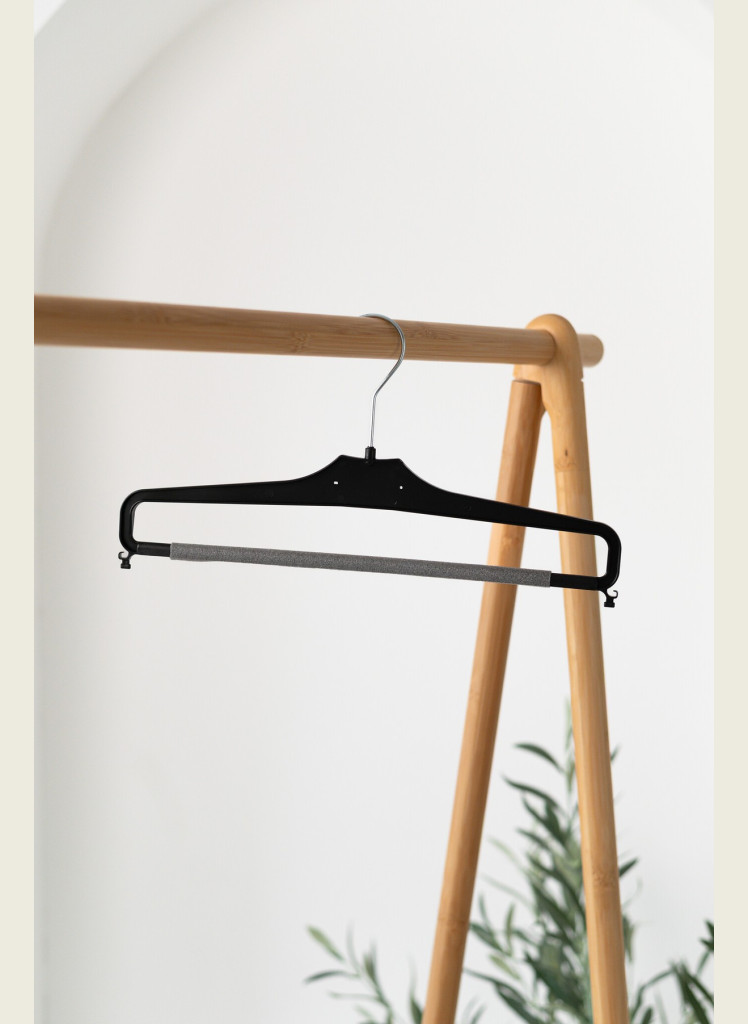 Vylepšená varianta ramínka K s molitanovou příčkou, která zabraňuje sklouzávání oblečení. Ideální pro jemné materiály a elegantní kousky. Díky háčkům na příčce můžete snadno zavěsit i sukně za poutka bez sklouzávání a molitanová příčka navíc zabraňuje sklouzávání kalhot.